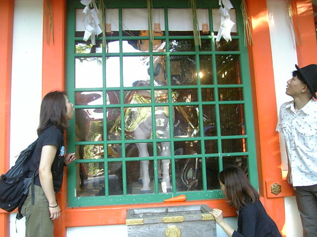 鳥居の前に白馬が鎮座しています!(人参のお供え物も…)