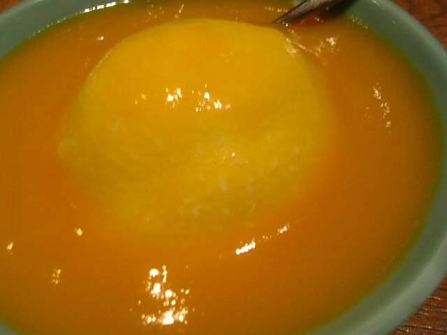 実はこれは、マンゴーアイスなのです。バニラアイスに、これでもかというくらいマンゴーピューレをかけてあります。