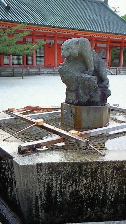 鳥居の前に白馬が鎮座しています!(人参のお供え物も…)