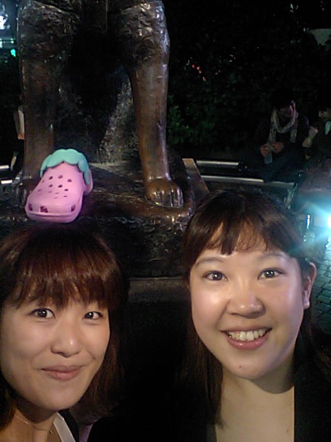 自分たちの顔メインでハチ公撮れず…。なぜかクロッギーなサンダルが片方だけお供え?!