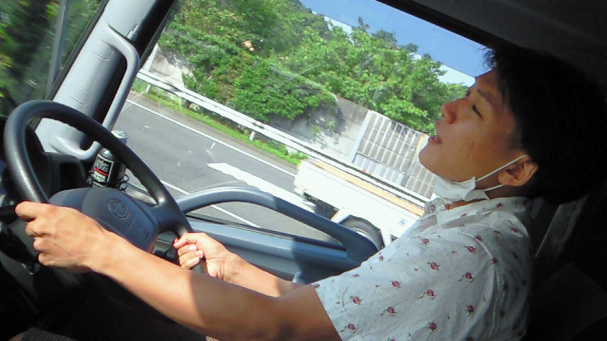 道の右側に紺色の看板、それにトラックが見えてきたらそこは…